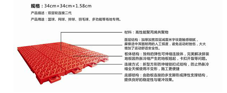 3、独特添加伸缩条式弹性锁扣设计,可有效缓解场地热胀冷缩等起鼓、形变情况